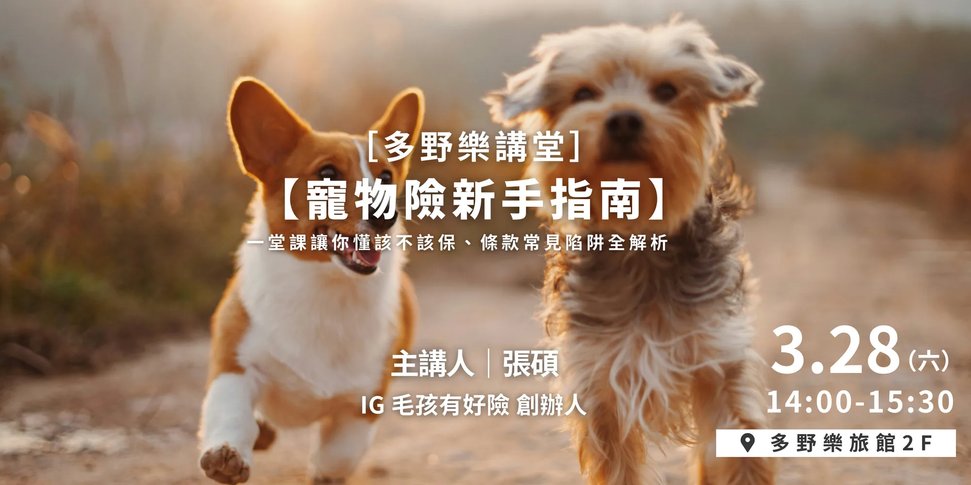 想給毛孩最好的保障,卻被密密麻麻的保單條款搞得頭大?保費繳了真的能賠嗎?多野樂講堂特別邀請寵物保險專家【IG毛孩有好險】,帶你撥開寵物險迷霧,從需求評估到條款細節,幫你守護荷包,更守護毛孩的醫療權益。