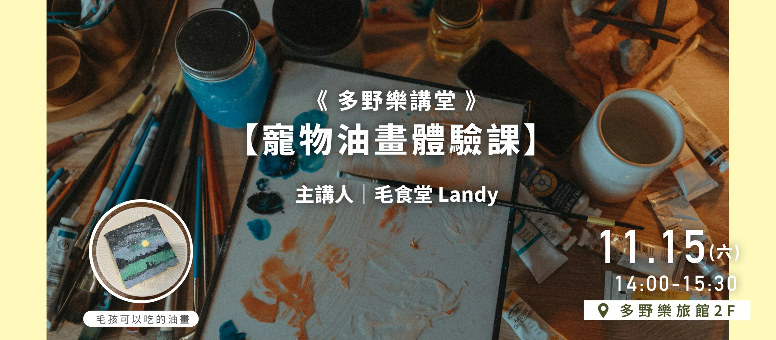 這堂特別的【可食用寵物油畫體驗課】,不僅家長可以親手繪出寶貝的模樣,畫布、顏料通通都是安全可食用成分,創作完還能成為毛孩的健康小點心!